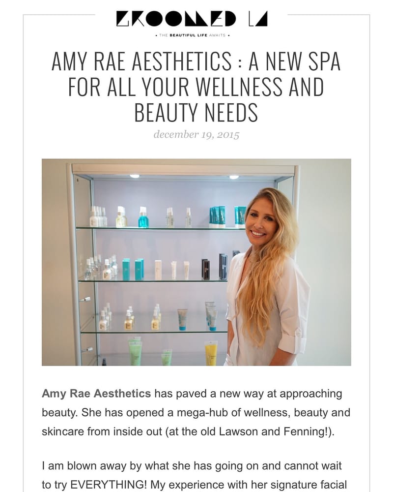Amy Rae Aesthetics received spotlight coverage on GroomedLA.com in an article published December 19, 2015, titled "AMY RAE AESTHETICS: A NEW SPA FOR ALL YOUR WELLNESS AND BEAUTY NEEDS."