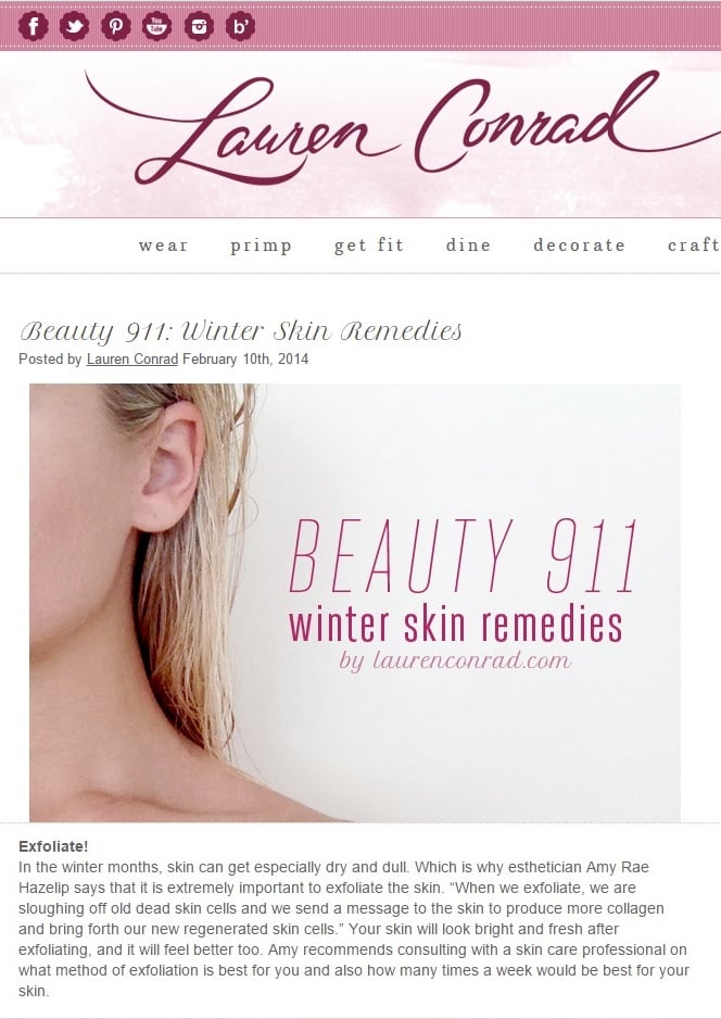 Amy Rae was highlighted as a skincare expert on LaurenConrad.com in a February 10, 2014 article titled "Beauty 911: Winter Skin Remedies." In this feature, posted by Lauren Conrad herself, Amy Rae Hazelip shared her professional expertise on winter skincare solutions.